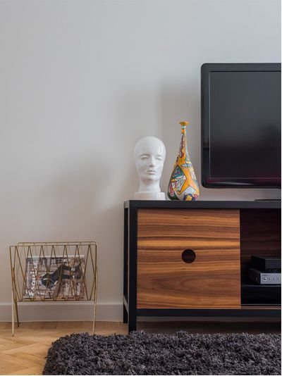 — Новая история квартиры закрутилась вокруг комода, который я увидела в “Инстаграме”. Русский дизайнер, ручная работа, невероятного возраста дубы из Ижевска, которые 16 лет сушили на подворье одного из местных мастеров, — обожаю такие вещи с историей. А ещё это комод из коллекции в духе 1950-х, то есть времён постройки дома, — рассказала Ксения Собчак.
