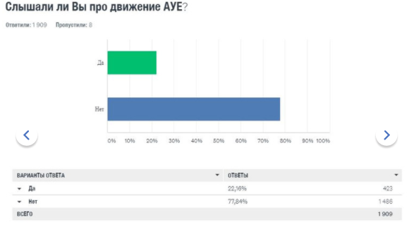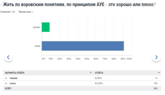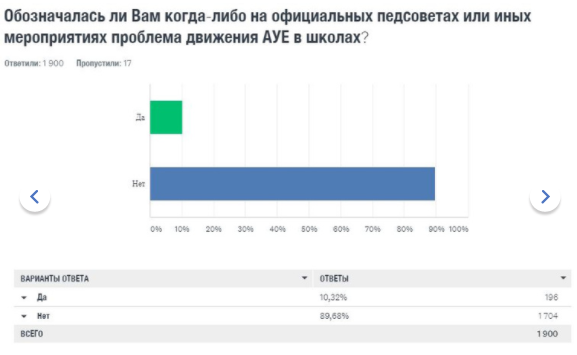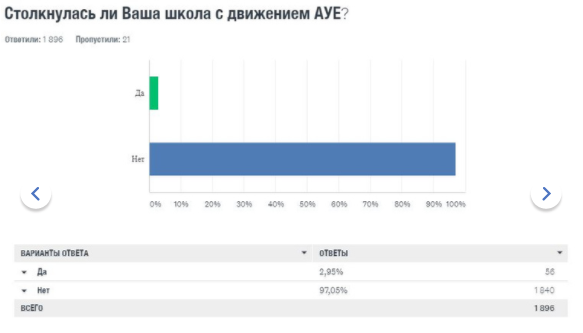 Результаты исследования ошеломляют. Об АУЕ слышали 22 процента учителей. Лишь три процента педагогов считают, что их школа столкнулась с этим явлением. При этом 10 процентов признаются, что проблема обсуждалась на педсоветах или иных официальных мероприятиях.