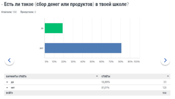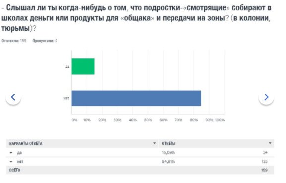 У учащихся — картина диаметрально противоположная: 75% школьников слышали об АУЕ, 56% процентов считают, что знают, что это такое. О поборах для «общака» осведомлены 15 процентов опрошенных школьников, 19 признают, что это практикуется в их школе.
